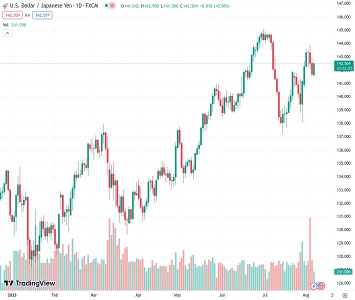 USDJPY currently trading at 142.52 at the time of writing. Pair opened at 141.76 and is trading with a change of 0.54 % .
