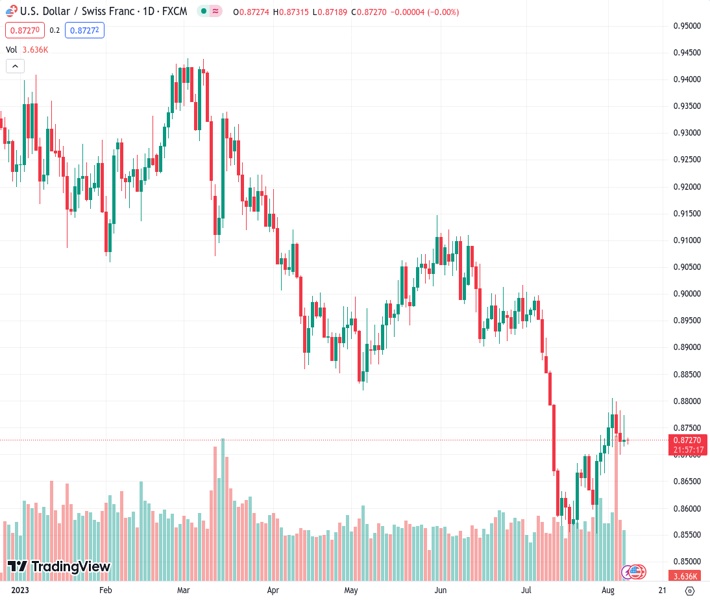 USDCHF currently trading at 0.8726 at the time of writing. Pair opened at 0.8727 and is trading with a change of -0.01 % .
