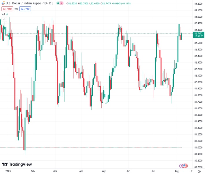 USDINR currently trading at 82.754 at the time of writing. Pair opened at 82.6545 and is trading with a change of 0.12 % .