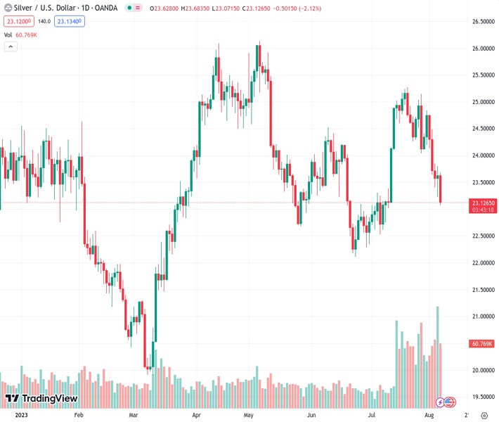 The XAGUSD pair, currently at 23.124, has declined significantly and reached its lowest point since July, around the $23.10 range. It has fallen below the 100-day Simple Moving Average (SMA).