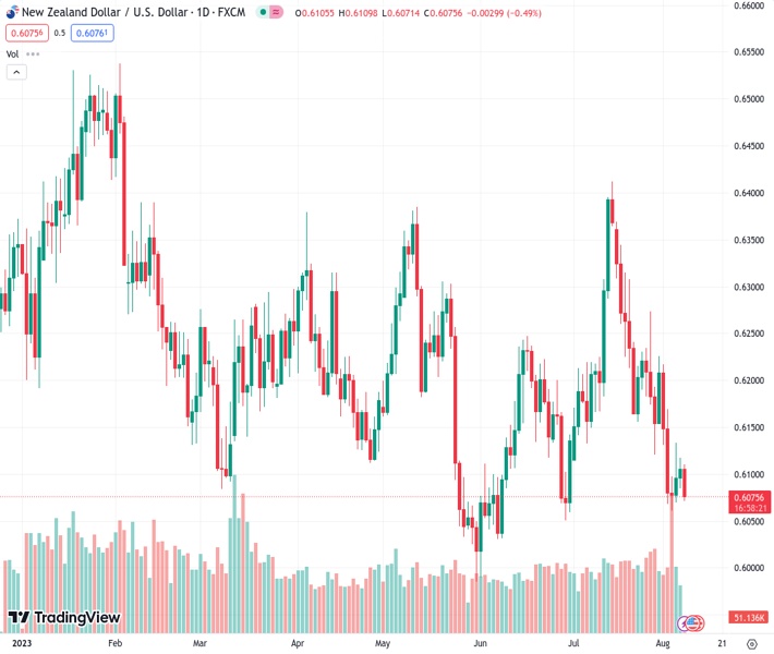 NZDUSD, trading at a level of 0.60793, faces increased selling activity on Tuesday due to a small increase in strength of the USD.