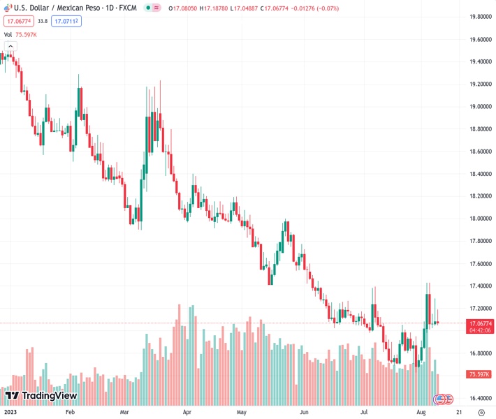 USDMXN currently trading at 17.0814 at the time of writing. Pair opened at 17.0986 and is trading with a change of -0.1 % .