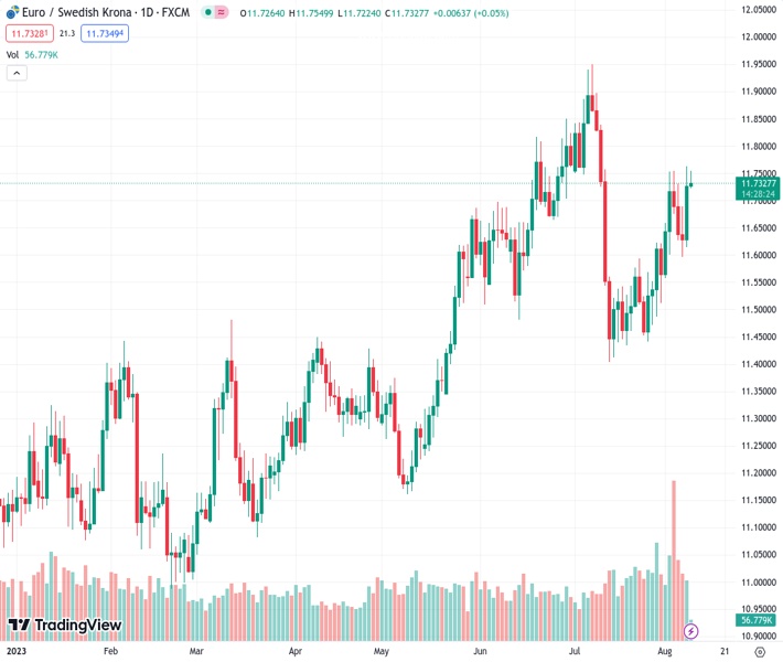 CIBC predicts that the EURSEK, currently at 11.7284, will continue to decrease in value in the upcoming months.