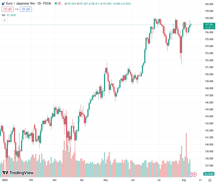 EURJPY currently trading at 157.11 at the time of writing. Pair opened at 157.09 and is trading with a change of 0.01 % .