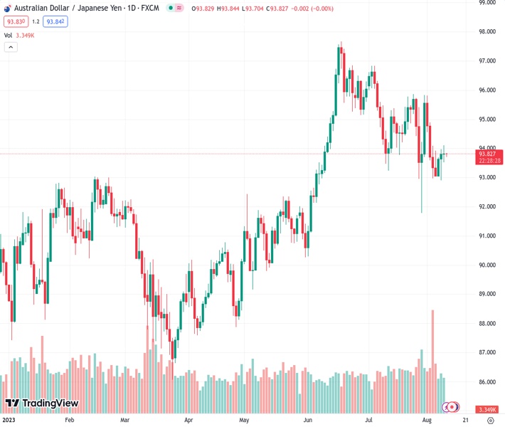 AUDJPY currently trading at 93.83 at the time of writing. Pair opened at 93.82 and is trading with a change of 0.01 % .