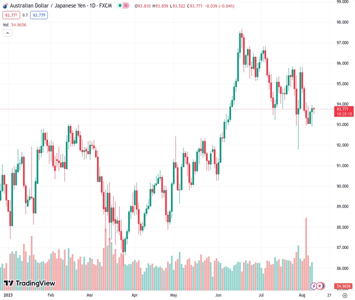 AUDJPY currently trading at 93.72 at the time of writing. Pair opened at 93.82 and is trading with a change of -0.11 % .