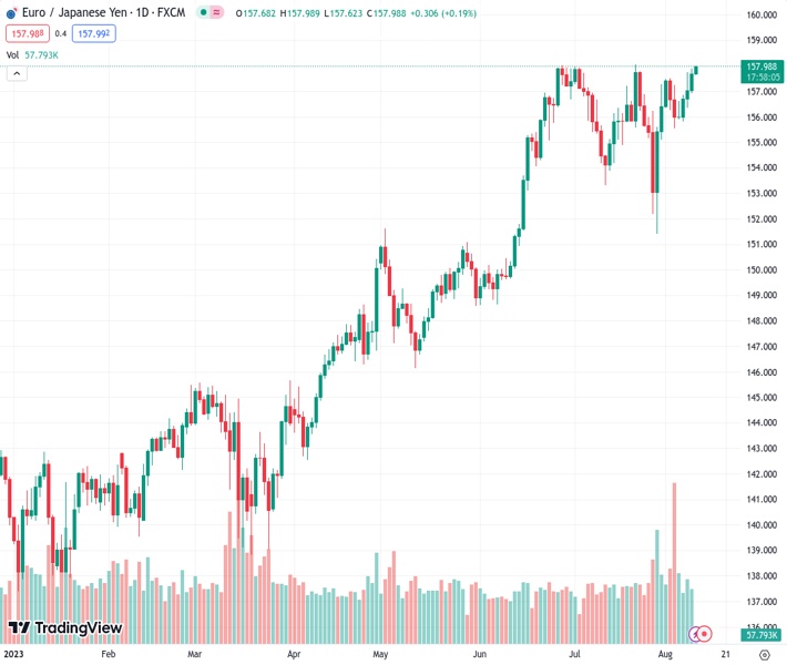 EURJPY currently trading at 157.89 at the time of writing. Pair opened at 157.75 and is trading with a change of 0.09 % .