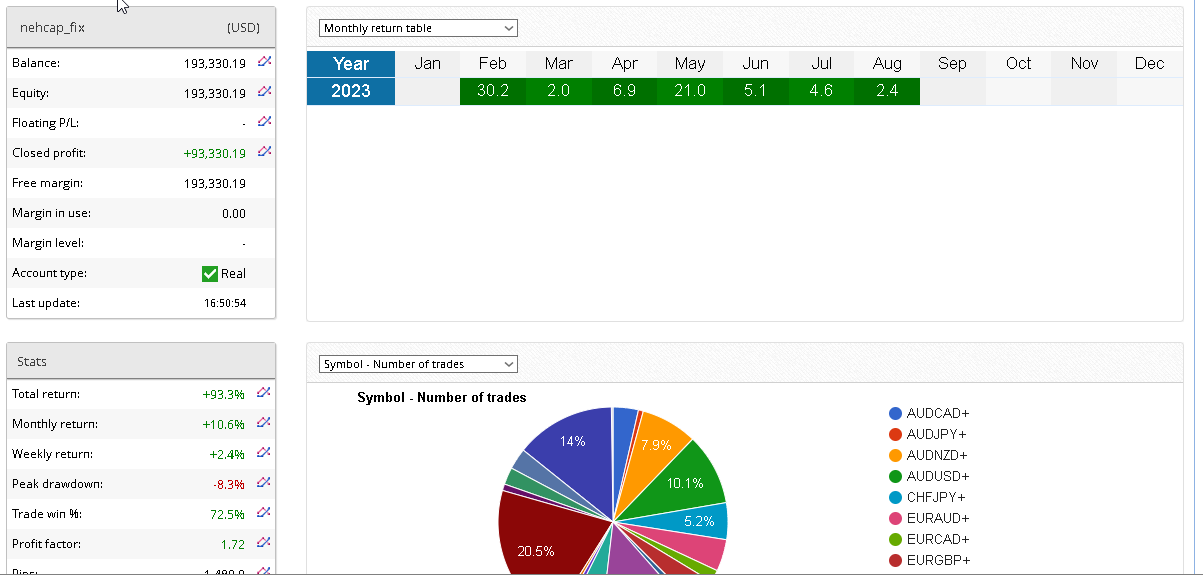 The August returns has risen to 2.4%. Overall returns now stand at +93.3%. The live account has risen from $100k to 193.3k.