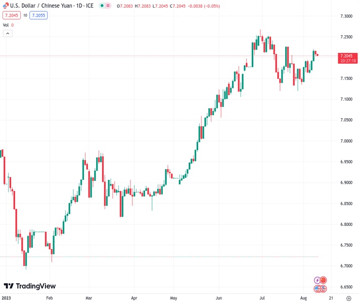The US dollar to Chinese yuan exchange rate is currently at 7.22006, while the People’s Bank of China has set the reference rate at 7.1576 compared to the previous rate of 7.1588.