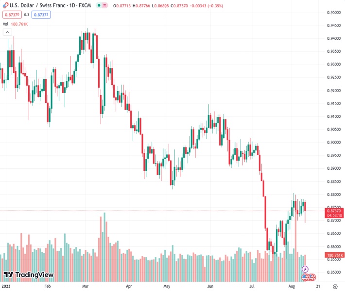 USDCHF currently trading at 0.8734 at the time of writing. Pair opened at 0.8772 and is trading with a change of -0.43 % .