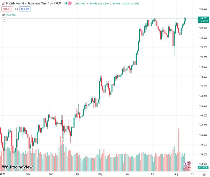 GBPJPY currently trading at 183.61 at the time of writing. Pair opened at 183.47 and is trading with a change of 0.08 % .