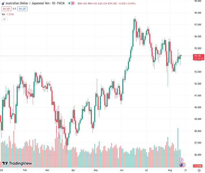 AUDJPY currently trading at 94.4 at the time of writing. Pair opened at 94.17 and is trading with a change of 0.24 % .