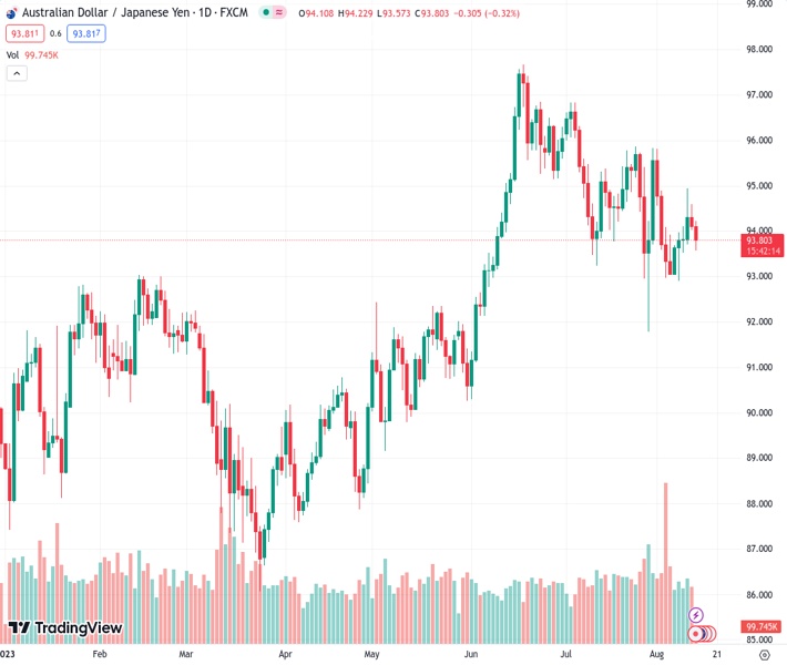 AUDJPY currently trading at 93.76 at the time of writing. Pair opened at 94.17 and is trading with a change of -0.44 % .