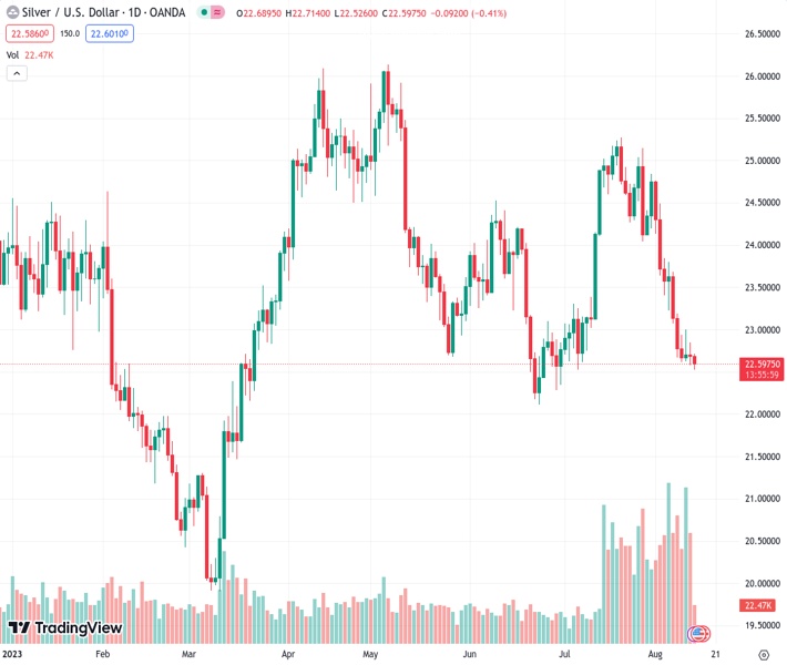 Silver is currently stabilizing at its lowest point since July 7th after experiencing a decline in value.