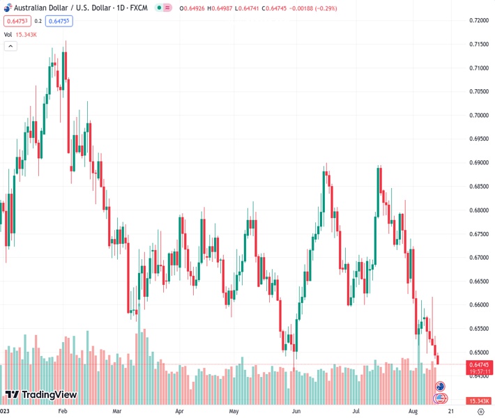 The AUDUSD exchange rate drops to a new low over concerns about China, Australia’s largest trading partner. @nehcap predicts that there will be more declines in the future.