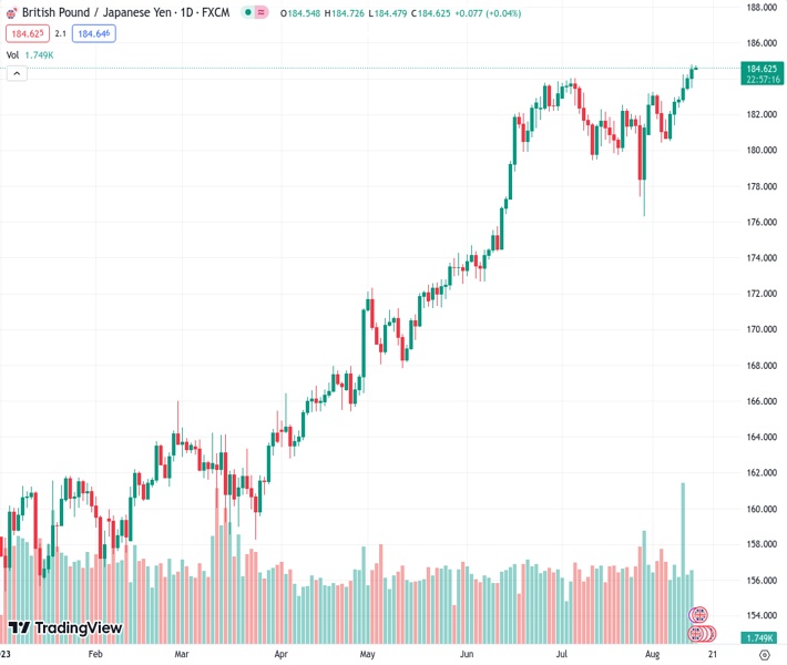 The GBPJPY pair reached a new high for the year at 184.77, indicating that the British pound is strong compared to the Japanese yen as the yen continues to weaken.