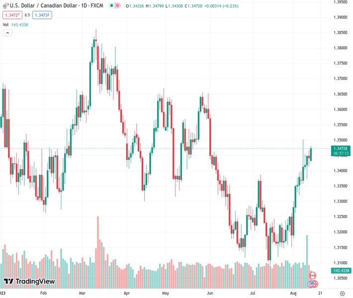 The USD/CAD pair, currently trading at 1.34727, is aiming to surpass the resistance level at 1.3500 due to the US Dollar’s strong performance.