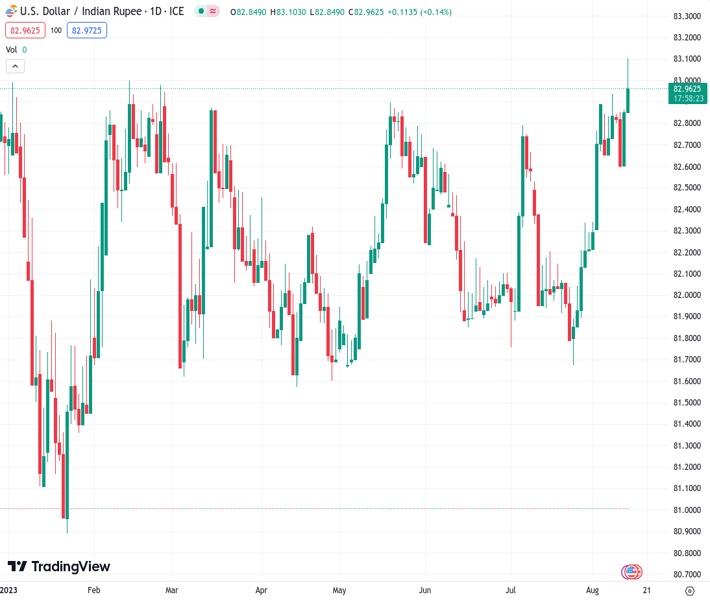 The USDINR currency pair, currently at 82.9730, continues to rise, reaching its highest point since late 2022, and maintaining an upward trend for the past three weeks.