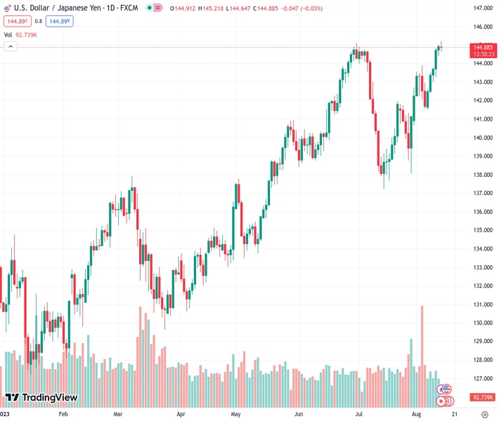 The USDJPY currency pair, trading at a level of 144.878, ends its four-day upward trend as the bullish investors pause at the year-to-date high mark.