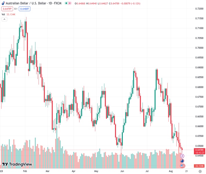 Bears are remaining cautious as China’s July Retail Sales and Industrial Production show a slight decline, with the AUDUSD trading at 0.64766.