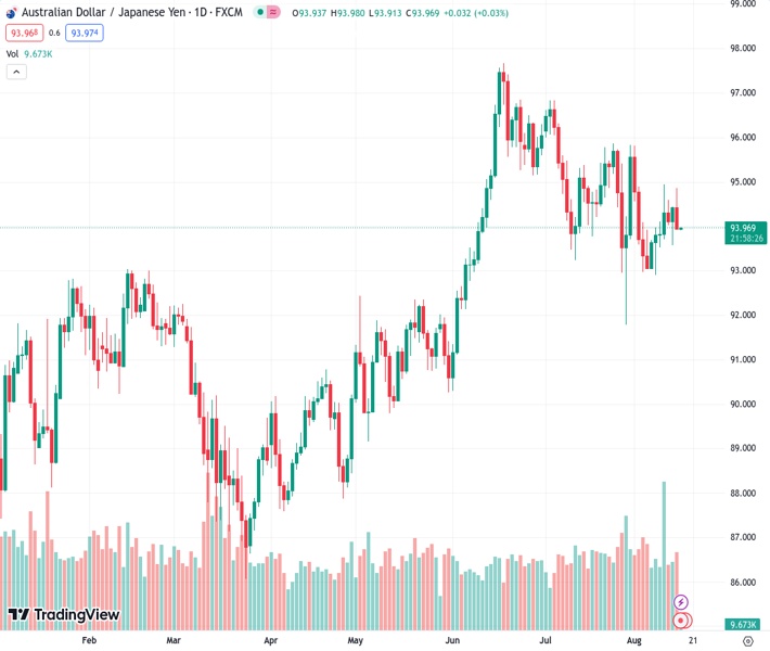 AUDJPY currently trading at 93.94 at the time of writing. Pair opened at 94.42 and is trading with a change of -0.51 % .