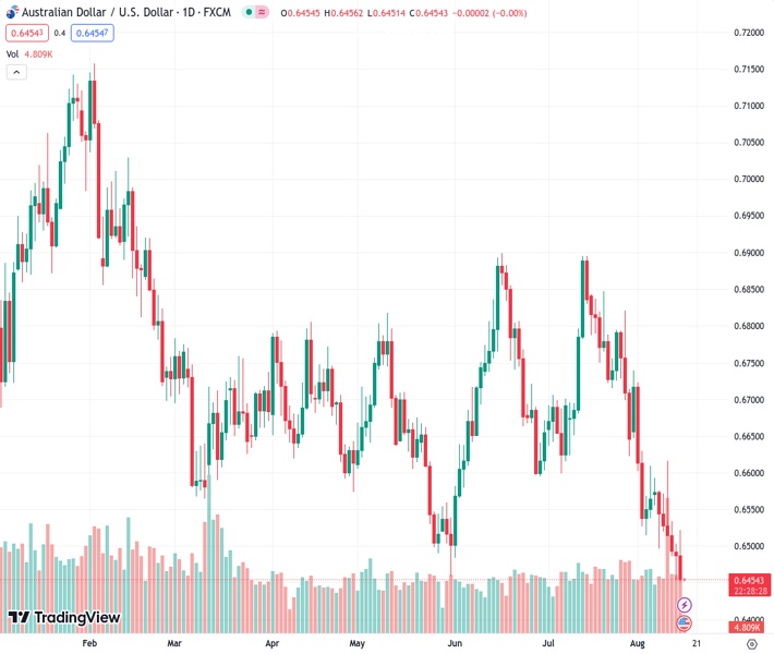 The AUDUSD currency pair is currently trading at 0.64539, and it is recuperating from its recent losses, reaching the lowest level of this year. It has dropped continuously for the past six days.
