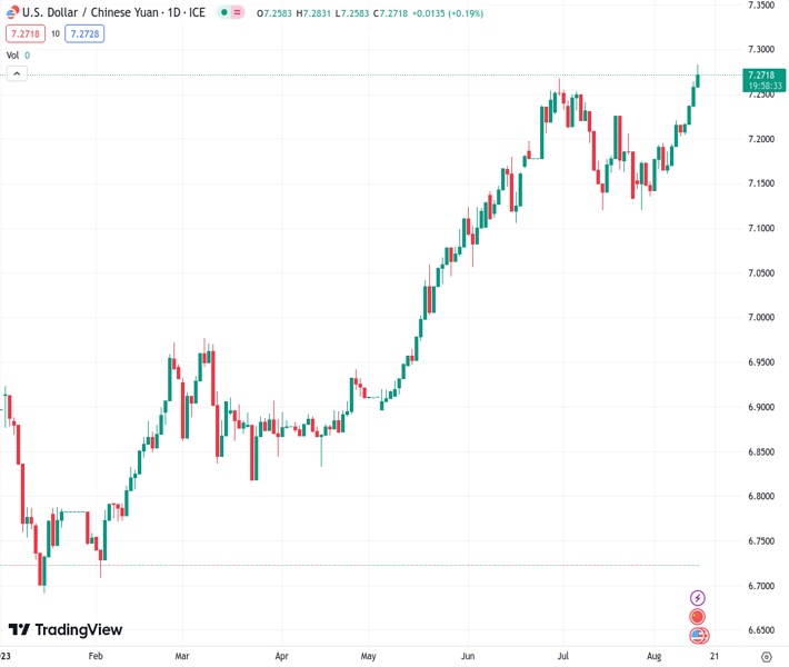 The exchange rate between the US dollar and the Chinese yuan is currently at 7.29240. The People’s Bank of China (PBOC) has set the reference rate at 7.1768 compared to the previous rate of 7.1686.
