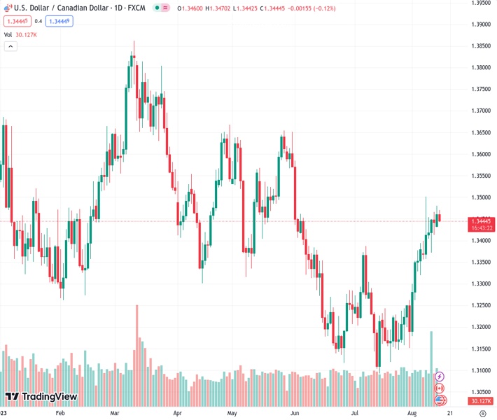 USDCAD currently trading at 1.3443 at the time of writing. Pair opened at 1.3461 and is trading with a change of -0.13 % .