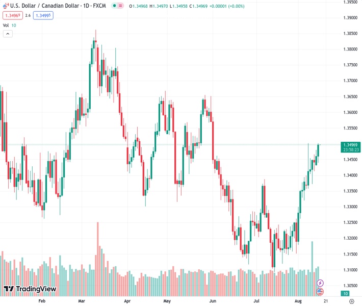 The USD/CAD saw green on Tuesday and increased near highs since early June, trading around 1.3500. On the one hand, the optimistic US Retail Sales from July made the market discount a more aggressive bet by the Federal Reserve (Fed) and favoured the USD. On the other hand, the Consumer Price Index (CPI) from July came in higher than expected, favouring the Canadian dollar, while lower Oil prices limited the upside potential.