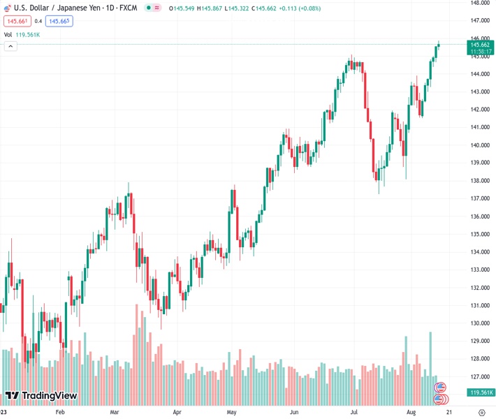 The USDJPY pair has continued to rise for a seventh consecutive day, reaching a new peak for the year on Tuesday, with a value of 145.612.