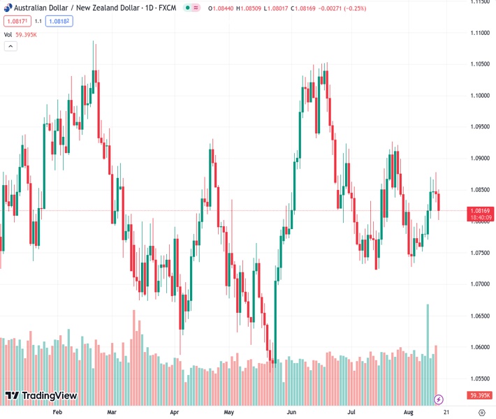 AUDNZD currently trading at 1.0816 at the time of writing. Pair opened at 1.0846 and is trading with a change of -0.28 % .