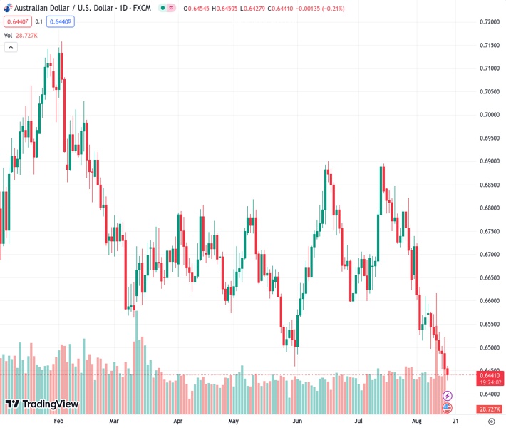 The AUDUSD pair, currently at a rate of 0.64395, has experienced a significant decline over the past week, reaching its lowest point of the year. However, the outlook from @nehcap suggests that the potential for further decline is limited.