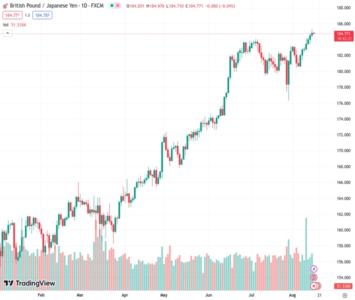 • GBP/JPY currently trades around 184.80, up 0.02% for the day.