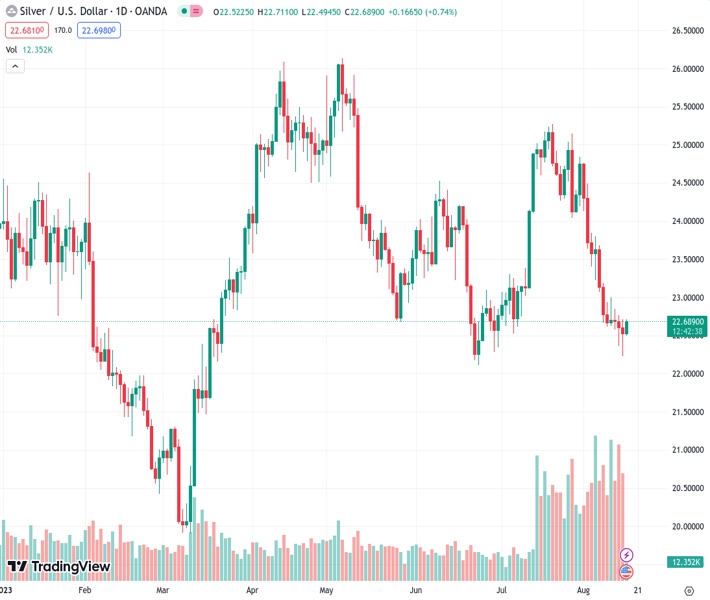 The price of silver, represented by #XAGUSD, has risen to 22.687, bouncing back from the lowest point it reached in almost two months on the previous day.