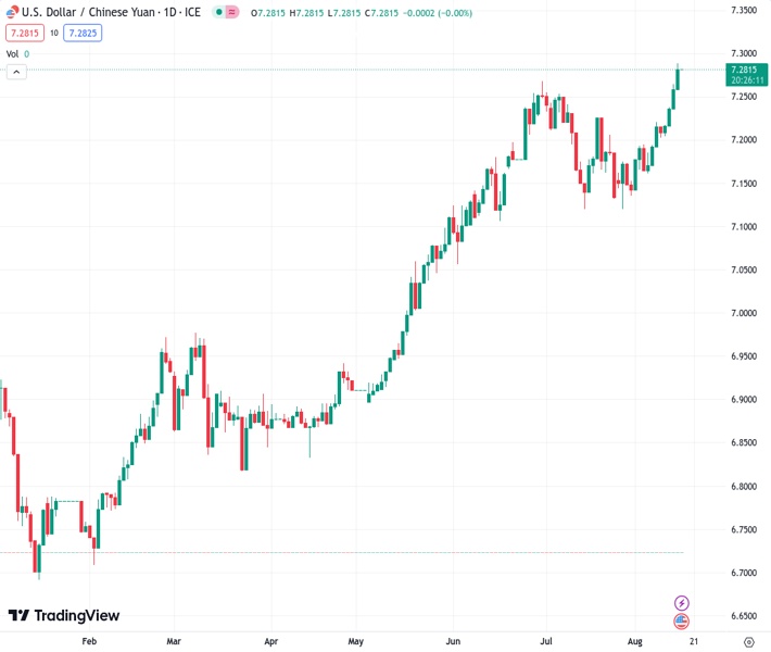 The US dollar to Chinese yuan exchange rate is currently at 7.32636. The People’s Bank of China (PBOC) has set the reference rate for the day at 7.1986, slightly higher than the previous rate of 7.1768.