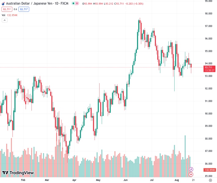 AUDJPY currently trading at 93.68 at the time of writing. Pair opened at 94.01 and is trading with a change of -0.35 % .