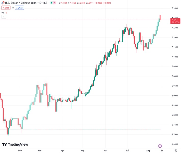 The consolidation phase at a high level for the USDCNY pair has ended, and now the upward trend has resumed, according to Credit Suisse. The exchange rate is currently at 7.31280.