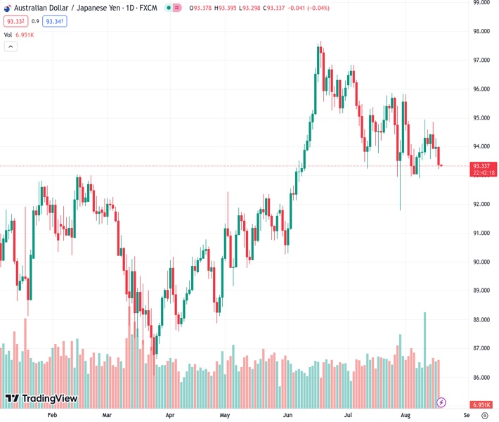 AUDJPY currently trading at 93.37 at the time of writing. Pair opened at 94.01 and is trading with a change of -0.68 % .