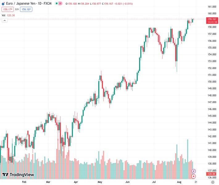 The EURJPY currency pair, at a rate of 159.136, ends a three-day period of gains but fails to maintain momentum.