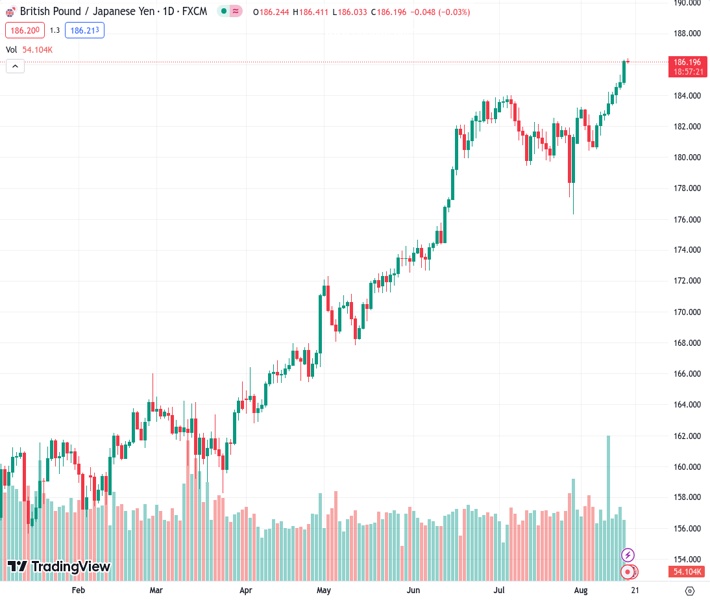 The GBPJPY pair hit a record high at 186.203 due to positive UK inflation data that exceeded expectations.