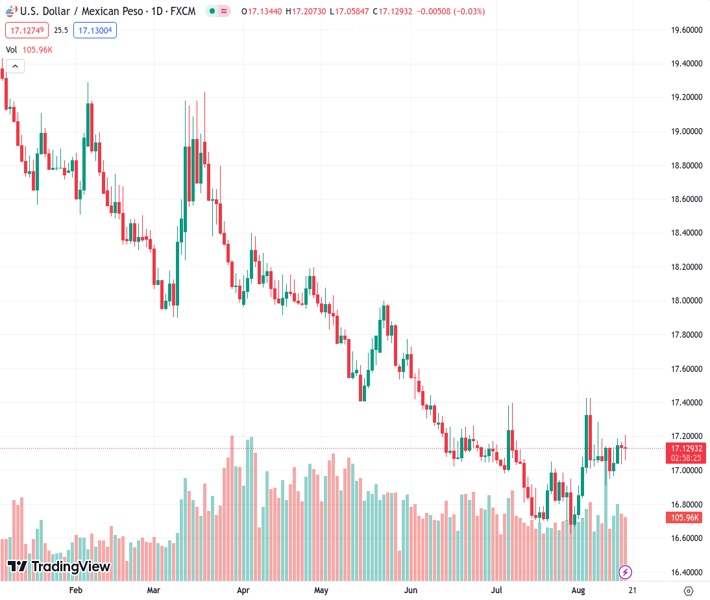 USDMXN currently trading at 17.0966 at the time of writing. Pair opened at 17.1348 and is trading with a change of -0.22 % .