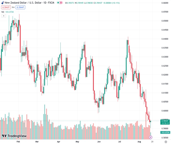 The NZDUSD currency pair reached its lowest point at 0.5903 since the month of November in the year 2022, when it was trading at 0.59376.