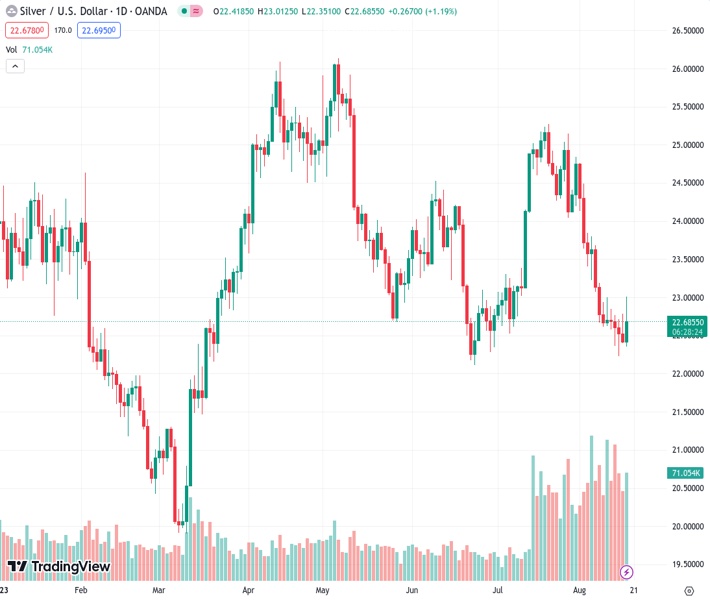 XAGUSD currently trading at 22.72 at the time of writing. Pair opened at 22.42 and is trading with a change of 1.34 % .