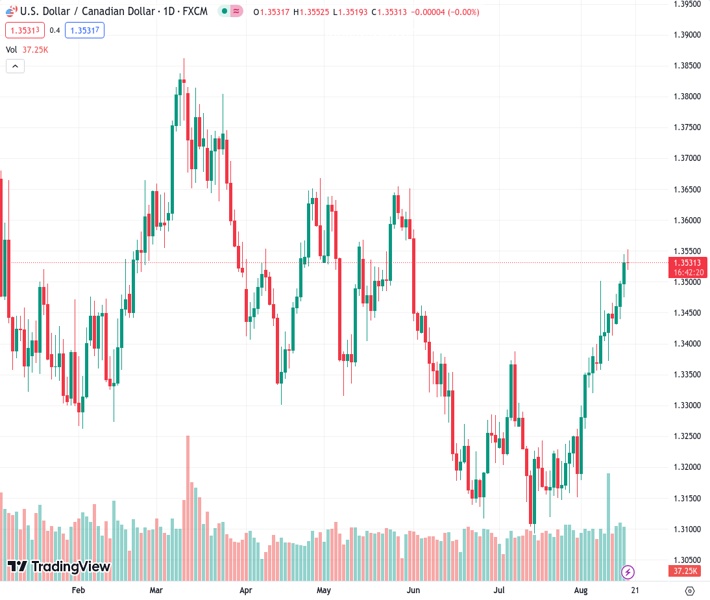 The US dollar against the Canadian dollar is currently trading at around 1.3530, slightly higher than the previous rate of 1.35323, due to strong US economic data. The market is closely watching the US Initial Jobless Claims for further direction.