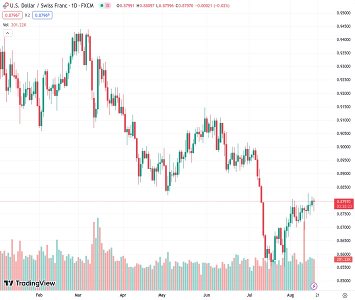 The USDCHF currency pair, with a value of 0.87969, dropped below 0.8800 and reached a low point of 0.8760 for the day.