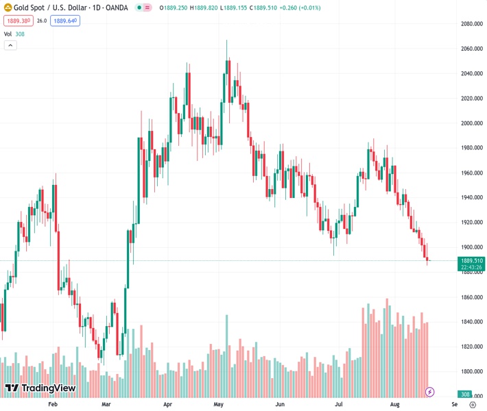XAUUSD currently trading at 1889.36 at the time of writing. Pair opened at 1891.76 and is trading with a change of -0.13 % .