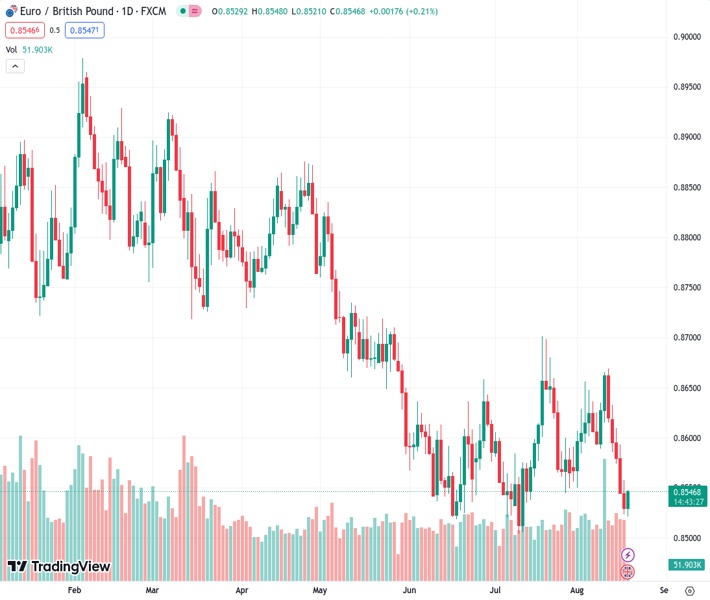 The EURGBP pair, currently trading at 0.85457, continues to rebound from its lowest point in the past five weeks in response to negative retail sales data from the UK.