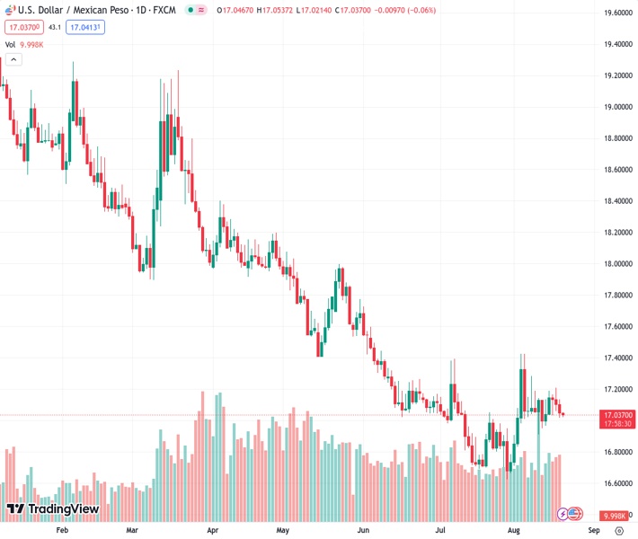 USDMXN currently trading at 17.0452 at the time of writing. Pair opened at 17.057 and is trading with a change of -0.07 % .
