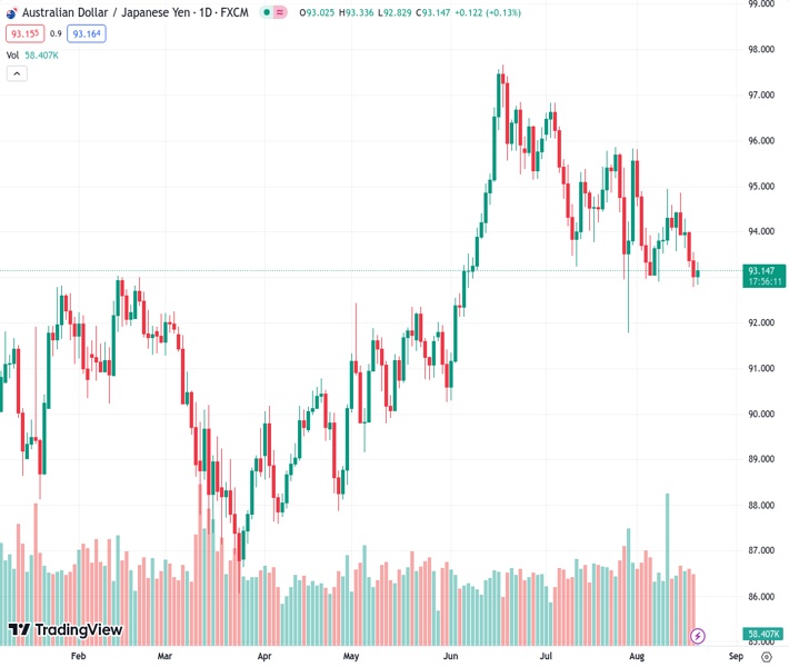 AUDJPY currently trading at 93.25 at the time of writing. Pair opened at 93.2 and is trading with a change of 0.05 % .
