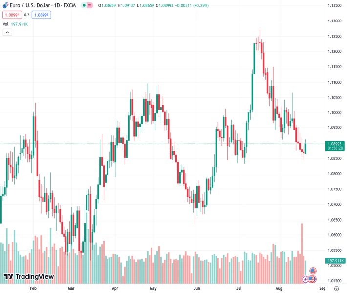 The Euro to US Dollar exchange rate has rebounded following a string of six days of declines and is currently hovering near the 1.0900 level.